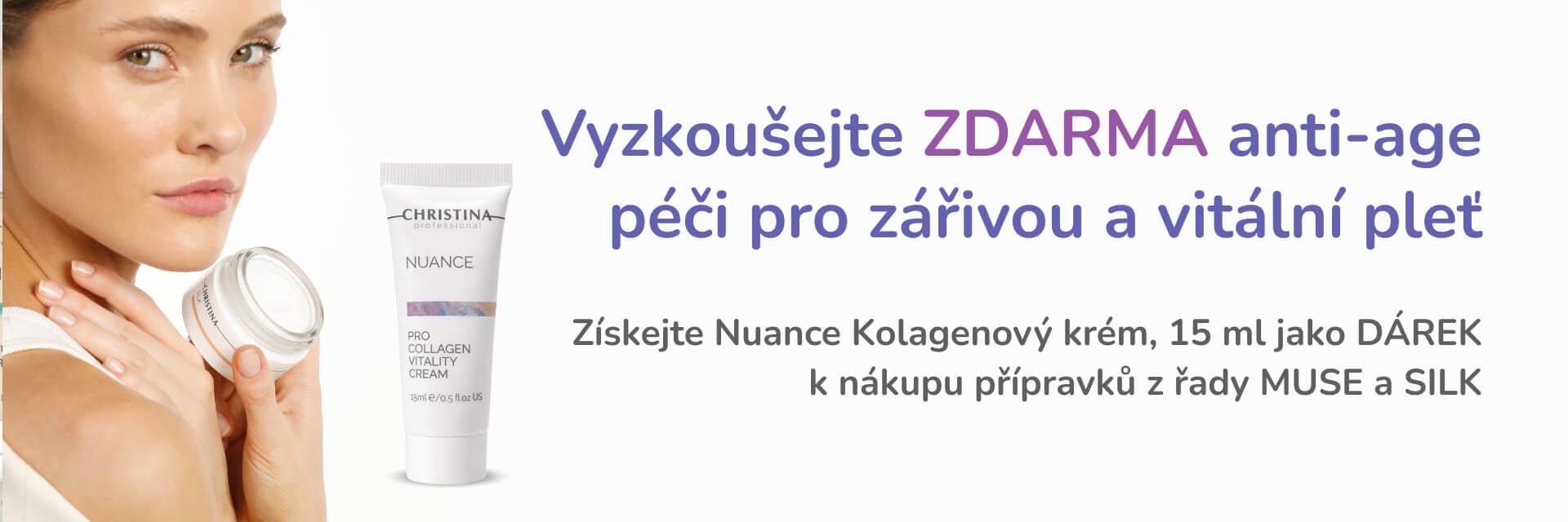 Získejte dárek k nákupu! Při koupi vybraných produktů z řady MUSE a SILK získáte Nuance Kolagenový krém pro vitalitu pleti, 15 ml jako dárek zdarma. Akce platí do 28.2.2026 nebo do vyprodání dárků.